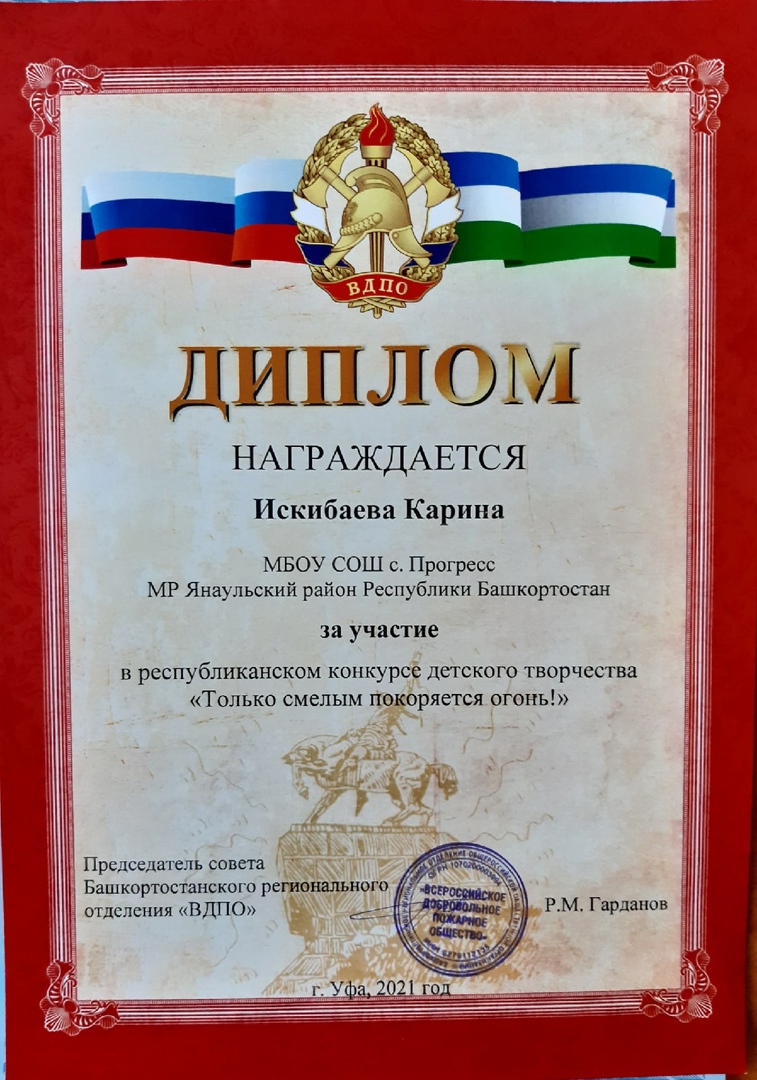 Дипломом награждаются Искаибаева Карина за участие в республиканском конкурсе детского творчества "Только смелым покоряется огонь"