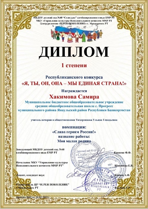 Хакимова Самира (8 кл.) приняла участие в республиканском конкурсе «Я, ТЫ, ОН, ОНА – МЫ ЕДИНАЯ СТРАНА!». ко Дню народного единства. Этот конкурс – замечательная возможность вспомнить важнейшие исторические события страны и сфокусировать внимание всех граждан нашей большой многонациональной страны на важность единства и сплочения. Ведь только в дружбе и в согласии можно преодолеть все испытания и двигаться к светлому будущему!